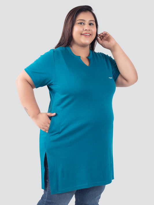 Plus Size Half Sleeves Long Top For Women -Teal Blue