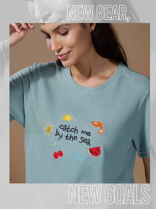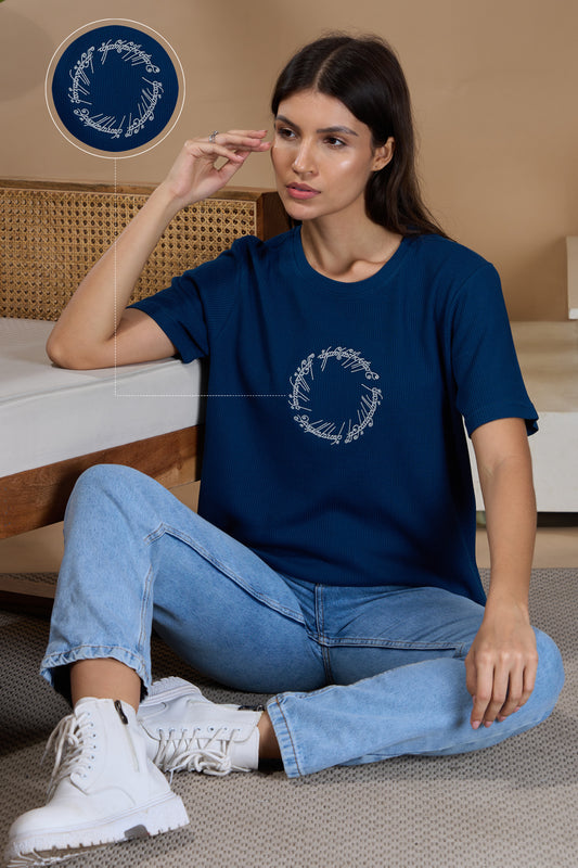 Regular price ₹ 3,350.00Sale price ₹ 3,350 Regular priceUnit price per₹ 2,500-34% OFFWoman One Ring Script Embroidered Cotton Relaxed Fit T-Shirt: Ocean Blue