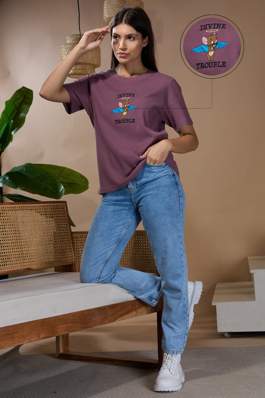 Regular price ₹ 2,995.00Sale price ₹ 2,995 Regular priceUnit price per₹ 3,50014% OFFWoman Divine Trouble Textured Cotton Relaxed Fit T-Shirt: French Lilac