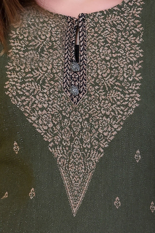 Regular price ₹ 995.00Sale price ₹ 995 Regular priceUnit price per₹ 1,59938% OFFChic Olive Green Knitted Woolen Winter Co-ord Set for Women | Embroidered Yoke Tunic & Border Trousers