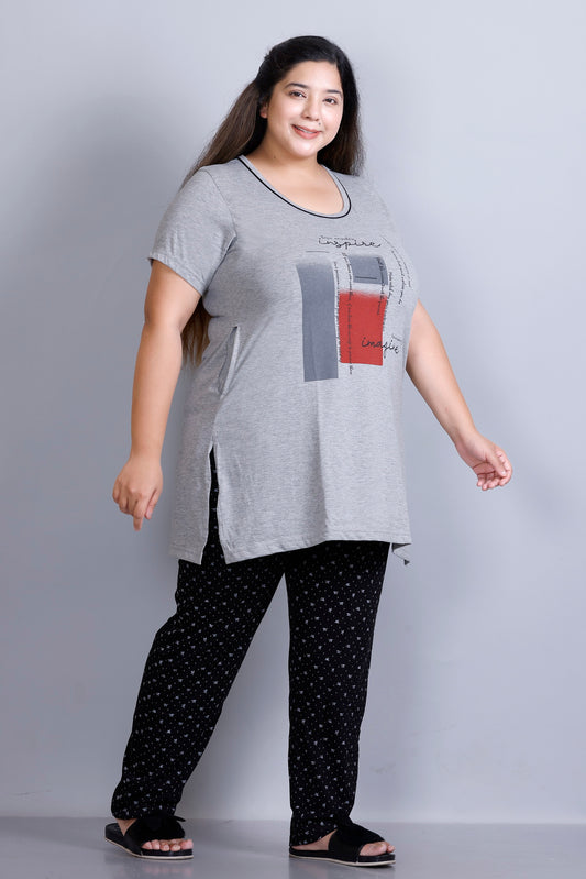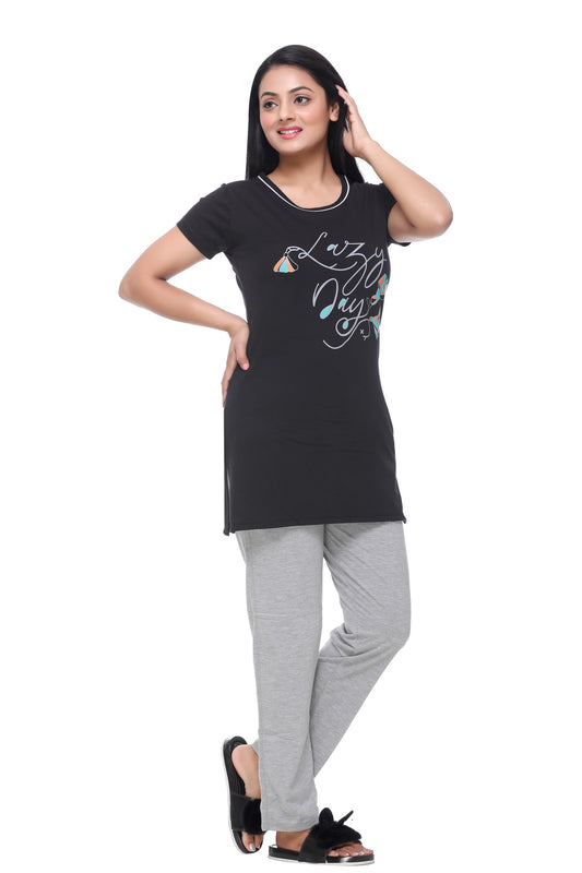 Cotton Nightsuit For Women - Long Top & Pyjama Set - Black & Grey