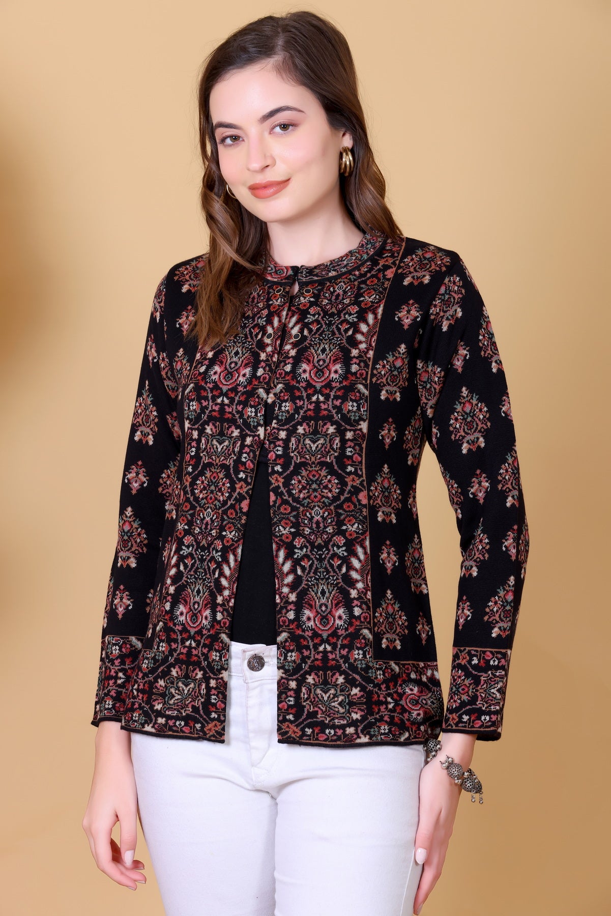 Black Jacquard Knit Warm Patterned Cardigan