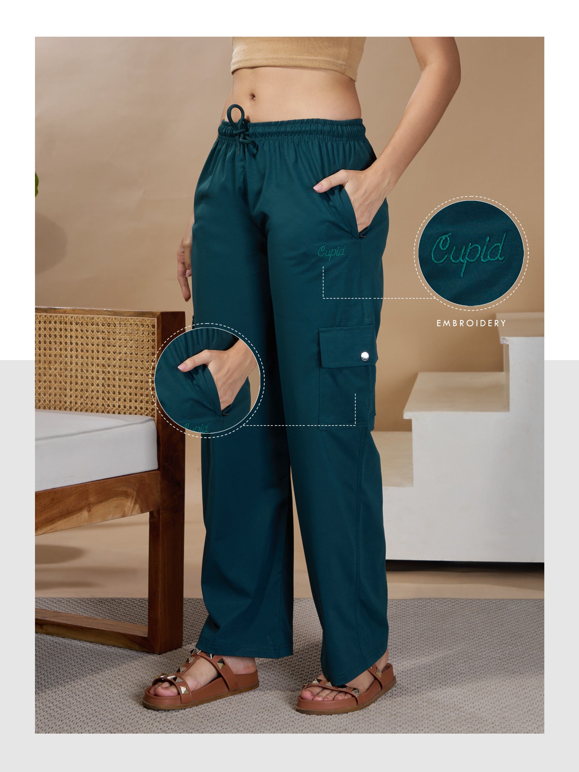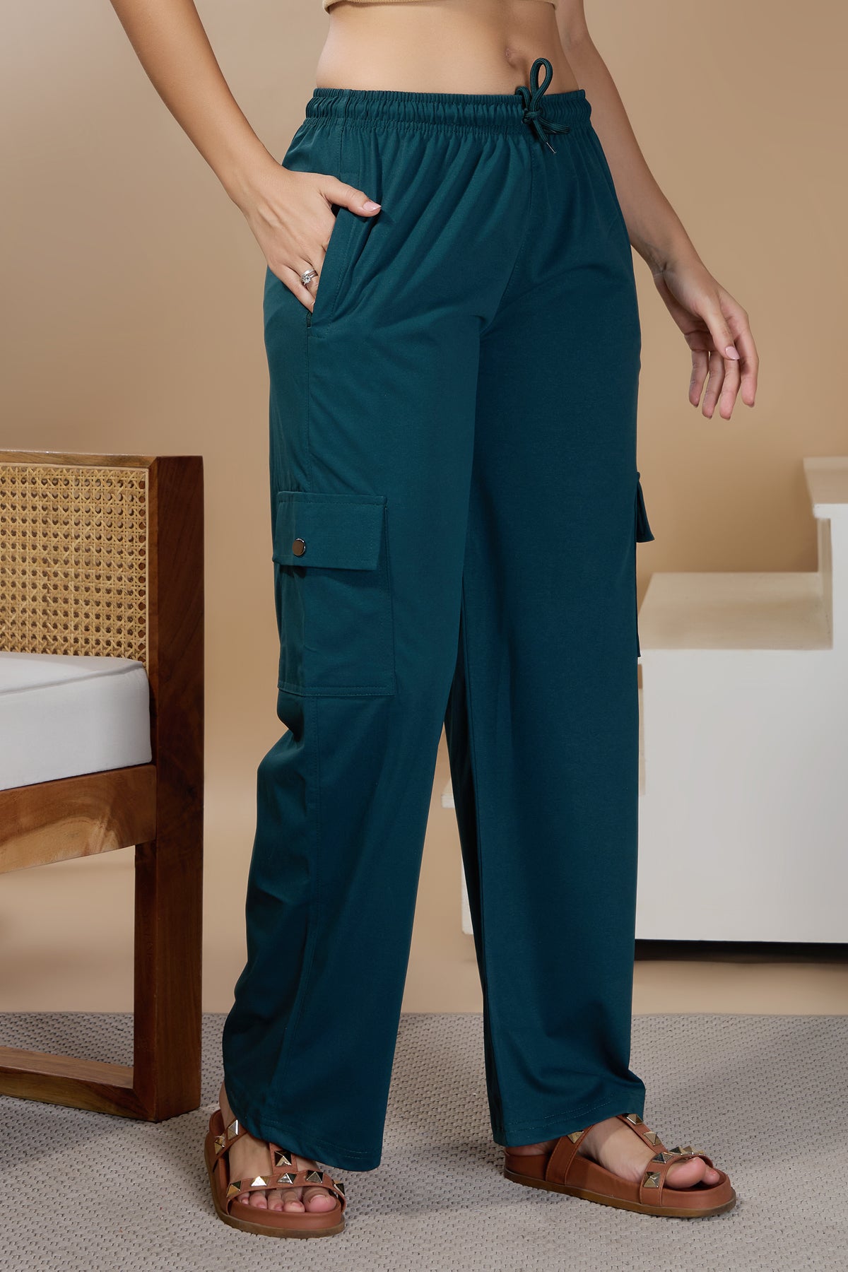 Women Smart Straight Fit Easy Wash Cargo Pants- Teal
